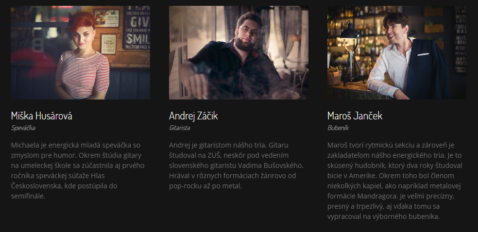 Sme energické, mladé trio bratislavských hudobníkov. Hráme cover verzie hitov slovenských a zahraničných interprétov. V našom repertoári nájdete široké spektrum žánrov ako rock, pop, blues, reggae, rock’n’roll, funky. Venujeme sa živým “unplugged” koncertom, ale na želanie vieme ponúknuť aj show s celou kapelou. Našim programom spestríme a spríjemníme atmosféru Vašej firemnej party, oslavy, svadby, alebo akejkoľvek inej udalosti.